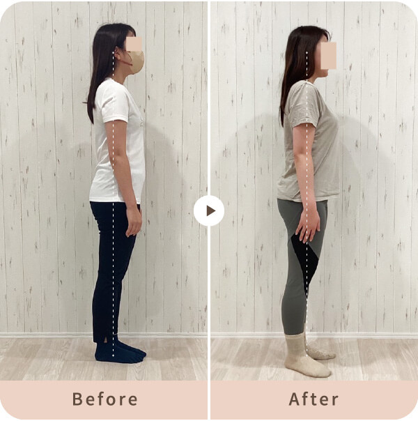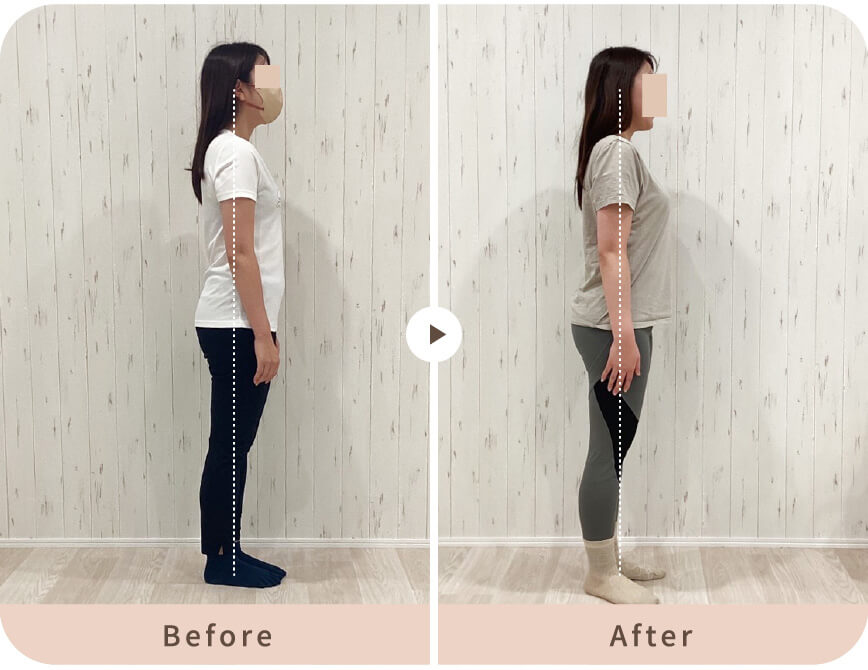 授乳や抱っこの影響で骨盤がスウェイバック(後傾)状態になりやすいために、お尻が垂れてしまったり、お腹の力も入りづらくなっておりました。骨盤が立ち、頭の位置が正しい位置に戻りることでヒップアップし、お腹周りもスッキリとしました。すらっとした綺麗な立ち姿になりました。